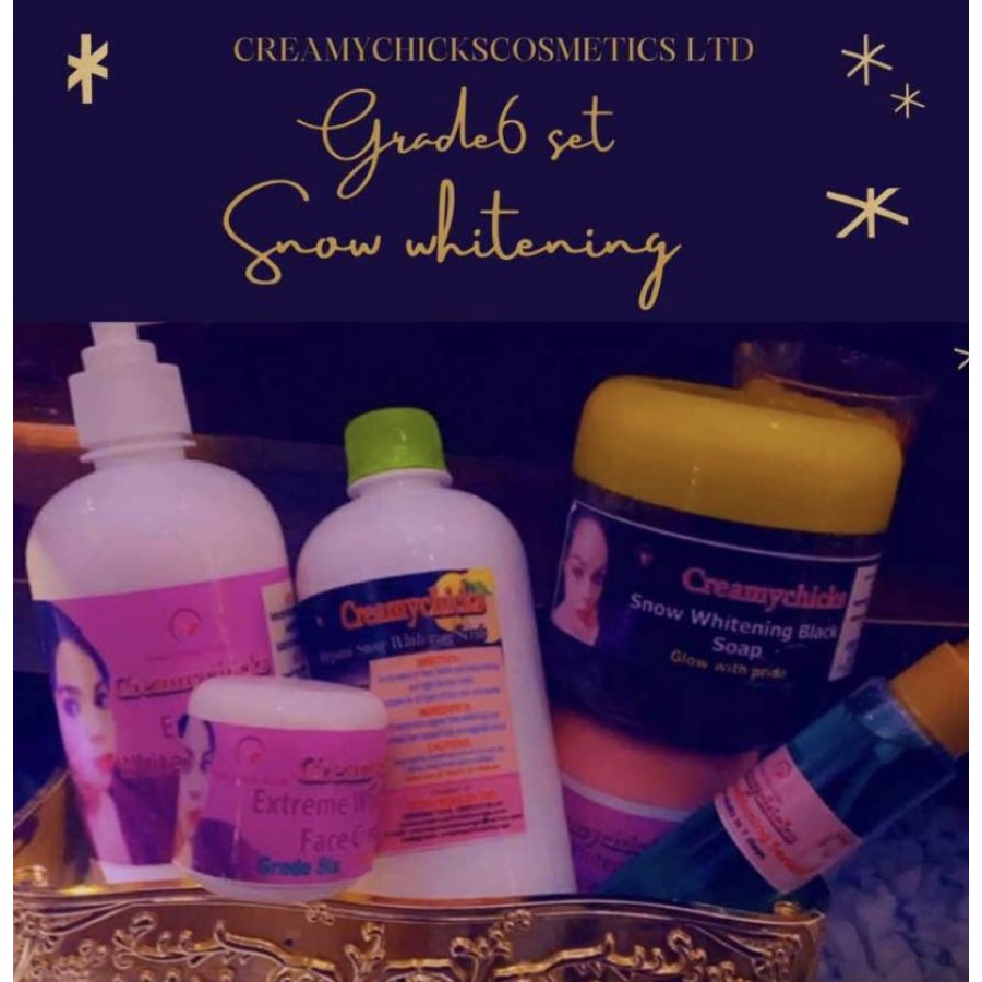 Our grade 6 snow whitening set is organically formulated for a snow whitening complexion, it has six snow whitening products (snow whitening face and body lotion with spf, cocumba extract snow whitening serum, anti-aging face cream , snow whitening black soap, snow whitening scrub )it gives an even complexion and it’s suitable for white skin lovers